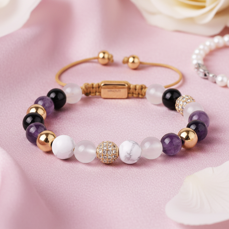 Eleganta Mindvit zīmola dabīgo akmeņu aproce sievietēm. Rūpīgi rokām darināta no 8 mm ametista, ahāta, hovlīta un nefrīta akmeņiem. Aproce sievietei, kura ir ceļā uz sevis labāko šīs dzīves versiju!