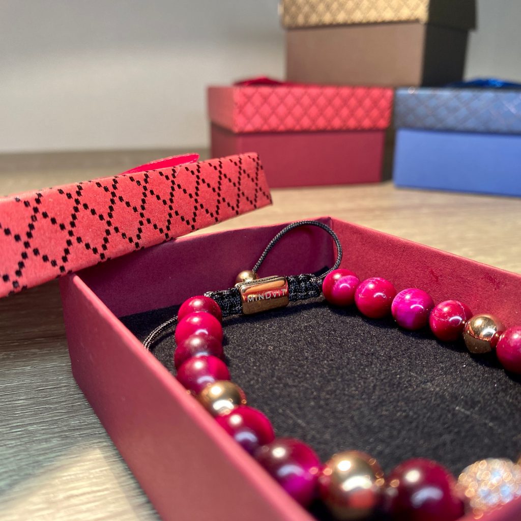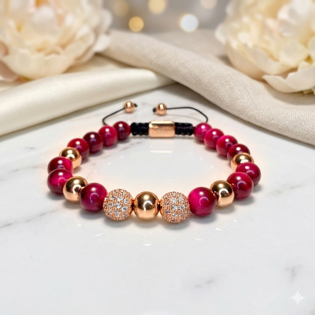 Eleganta Mindvit zīmola  aproce sievietēm. Rūpīgi rokām darināta no fuksijas tīģeracs akmeņiem, papildinājumā ar cirkonija luksus elementiem. Aproce sievietei, kura ir ceļā uz sevis labāko šīs dzīves versiju!