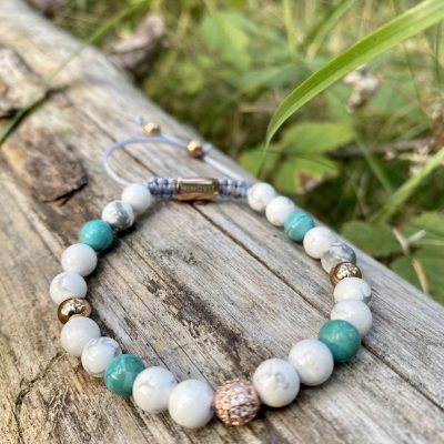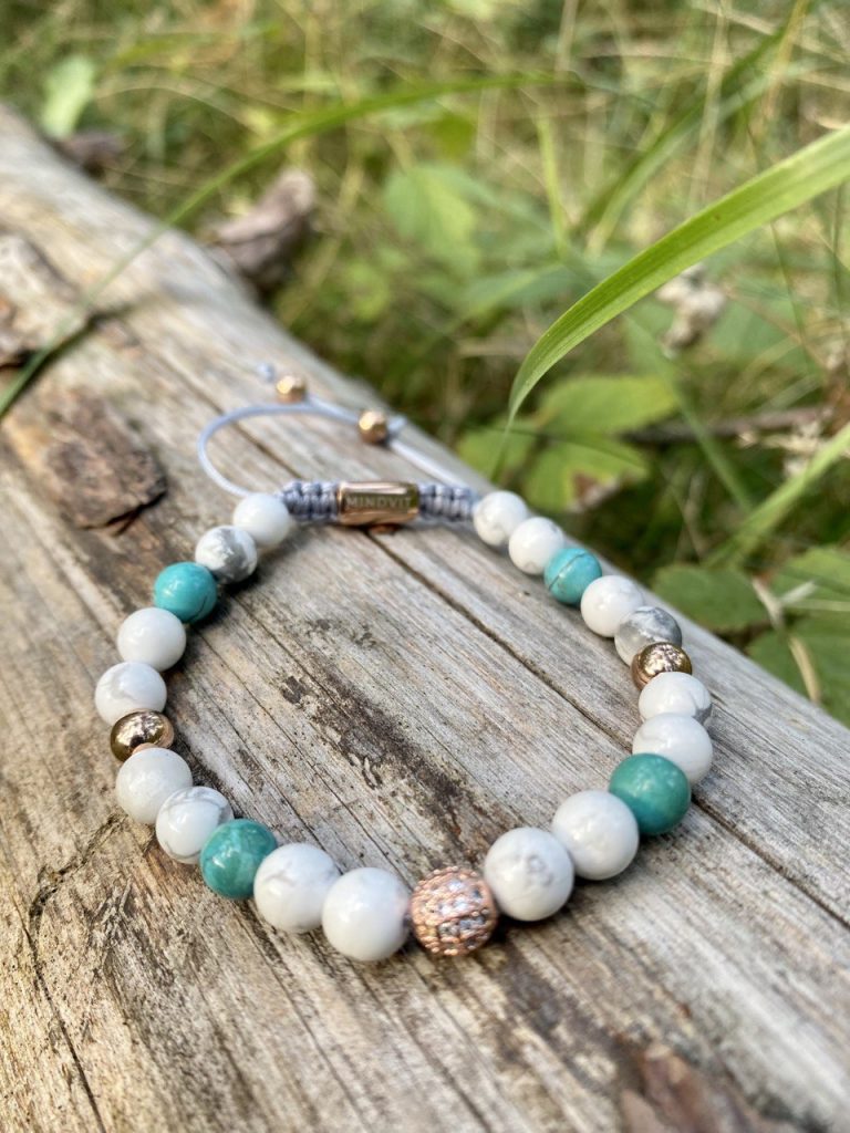 Eleganta Mindvit zīmola dabīgo akmeņu aproce sievietēm. Rūpīgi rokām darināta no hovlīta un tirkīza. Aproce sievietei, kura ir ceļā uz sevis labāko šīs dzīves versiju!