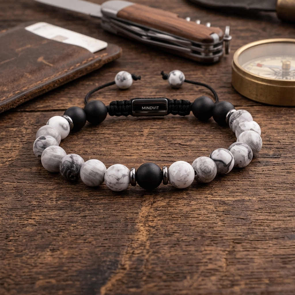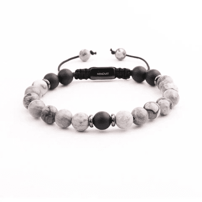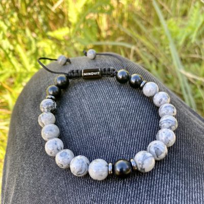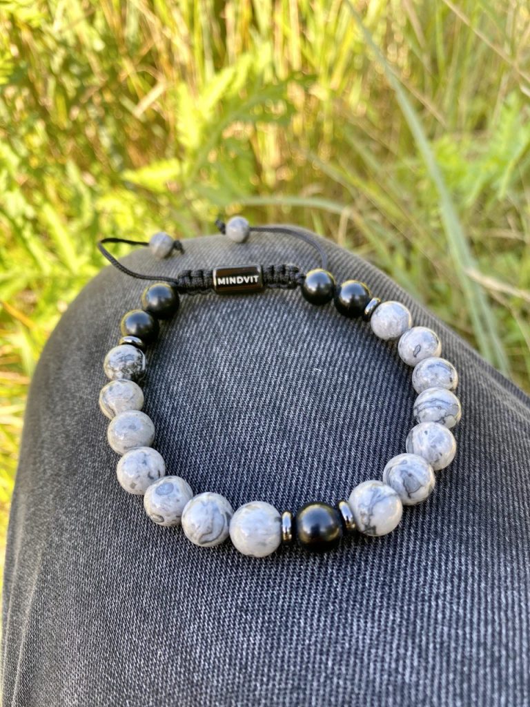 Eleganta Mindvit zīmola dabīgo akmeņu aproce vīrišiem. Rūpīgi rokām darināta no 8mm oniksa un jašma akmeņiem. Aproce vīriešiem, kuri ir ceļā uz savu labāko šīs dzīves versiju!