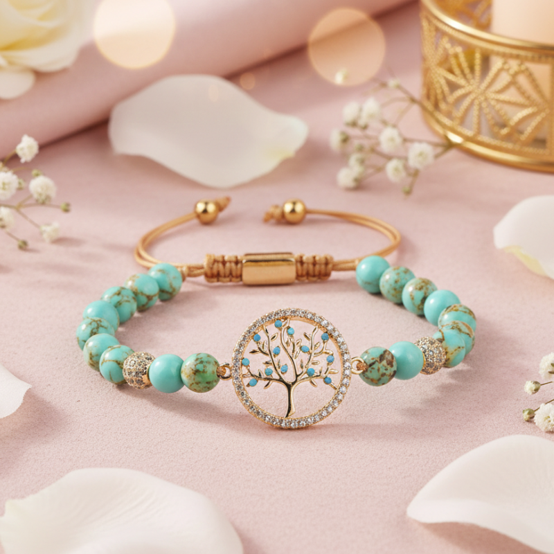 Eleganta Mindvit zīmola ”Domu spēka” aproce sievietēm. Rūpīgi rokām darināta no 6mm glliemežvāku pērlēm ar tirkīza akmens pārklājumu un elegantu cirkonija ”Dzīvības koka” elementu. Aproce sievietei, kura ir ceļā uz sevis labāko šīs dzīves versiju!